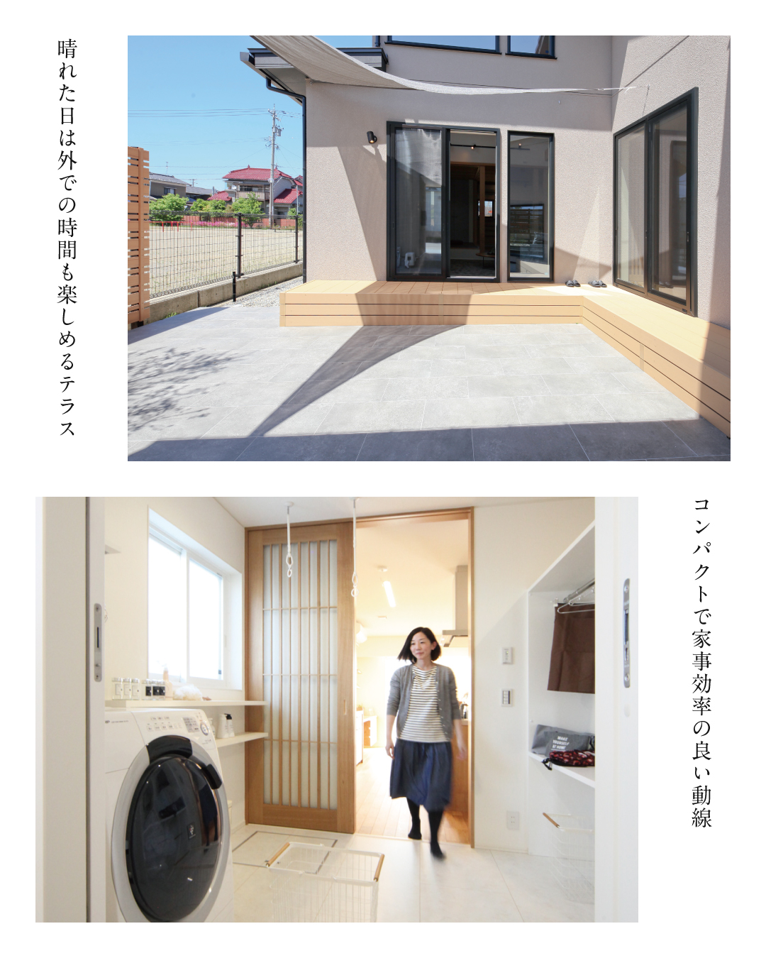 フロアラインが一段下がった居心地の良いサンクンリビング ワンフロア完結型の暮らしを叶える一階寝室 晴れた日は外での時間も楽しめるテラス コンパクトで家事効率の良い動線