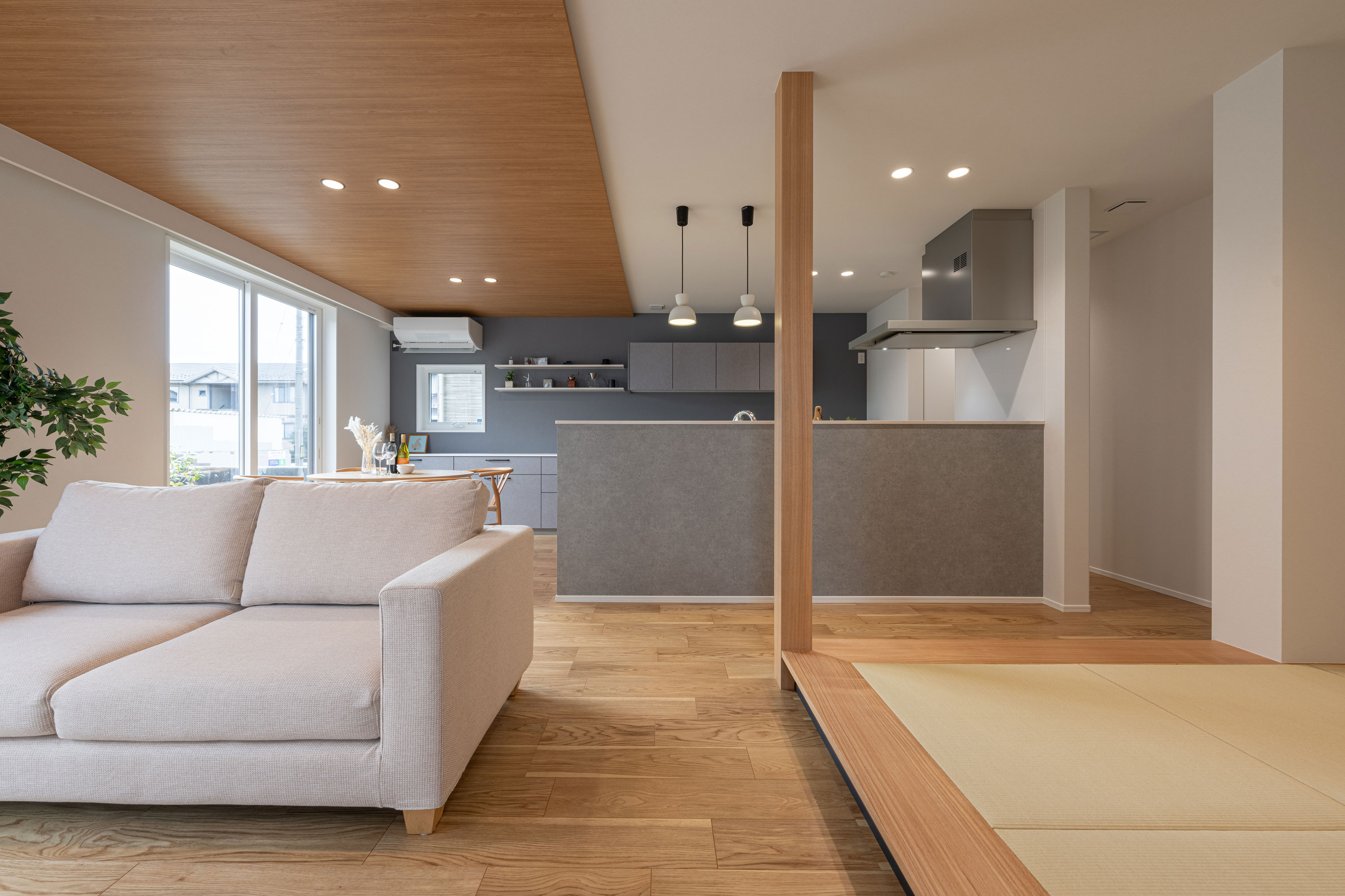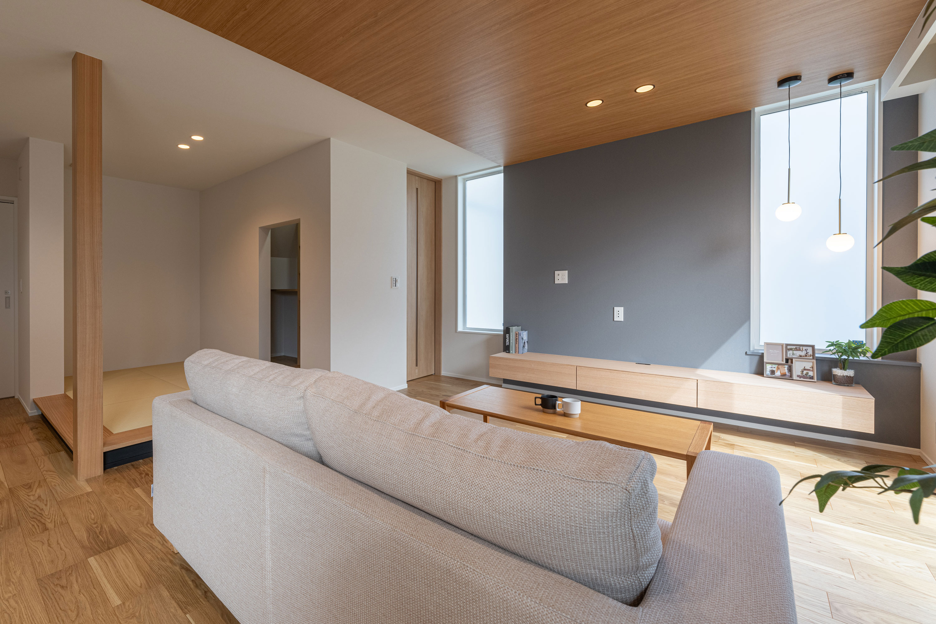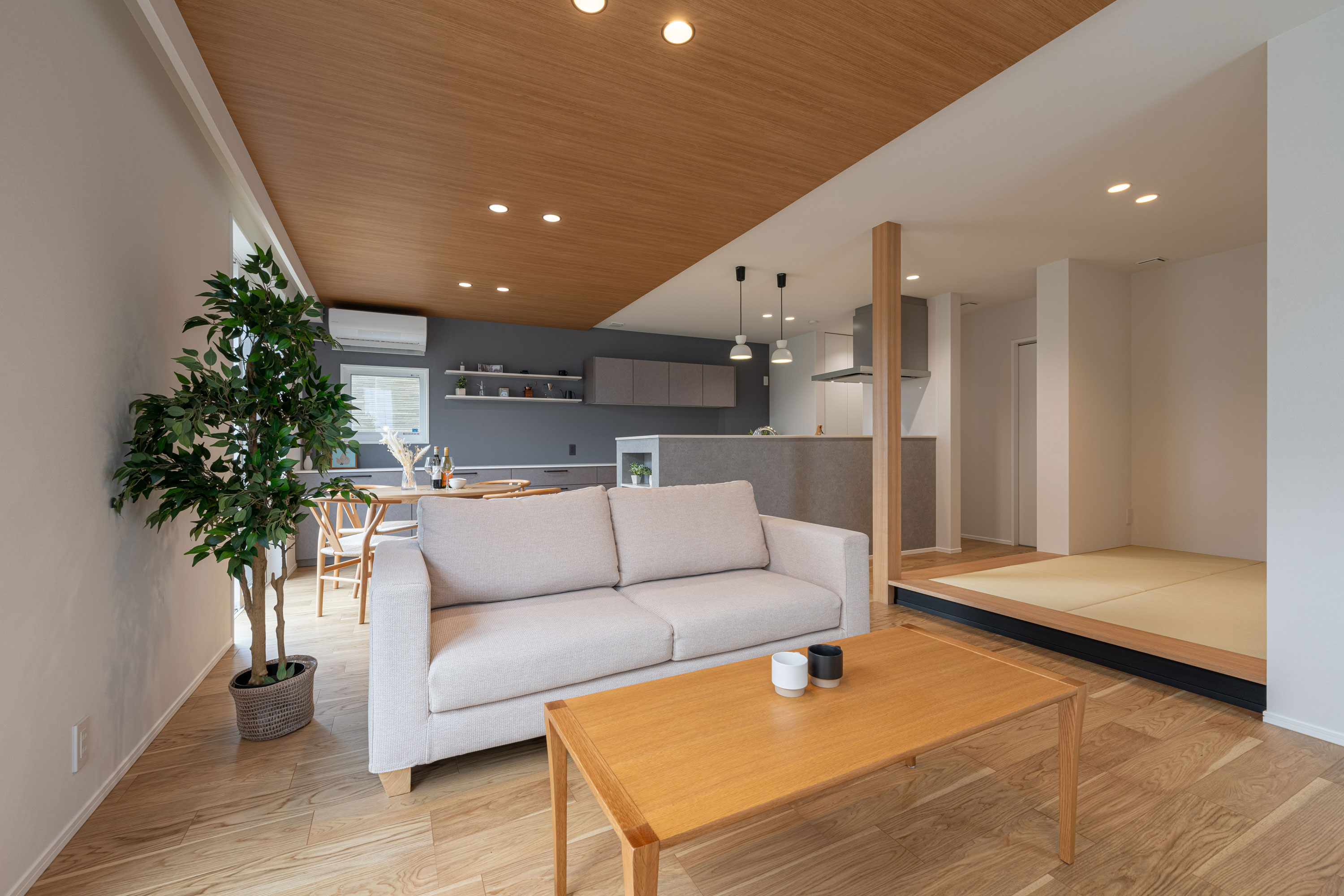 ソファに座った時にも圧迫感を感じさせない畳コーナー隣接のリビング等