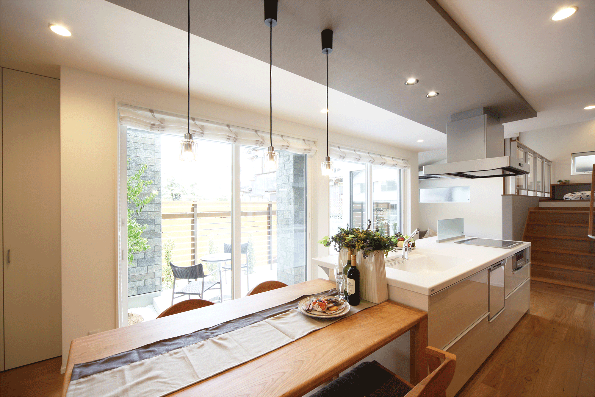 ・住まいの中心に設けたテラスを臨むダイニングキッチン。光と風がたっぷり入るこの家の特等席です。