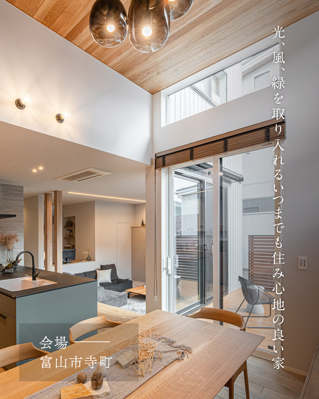 2. 富山市寺町 光、風、緑を取り入れるいつまでも住み心地の良い家 ダイニング高天井 スキップエリア