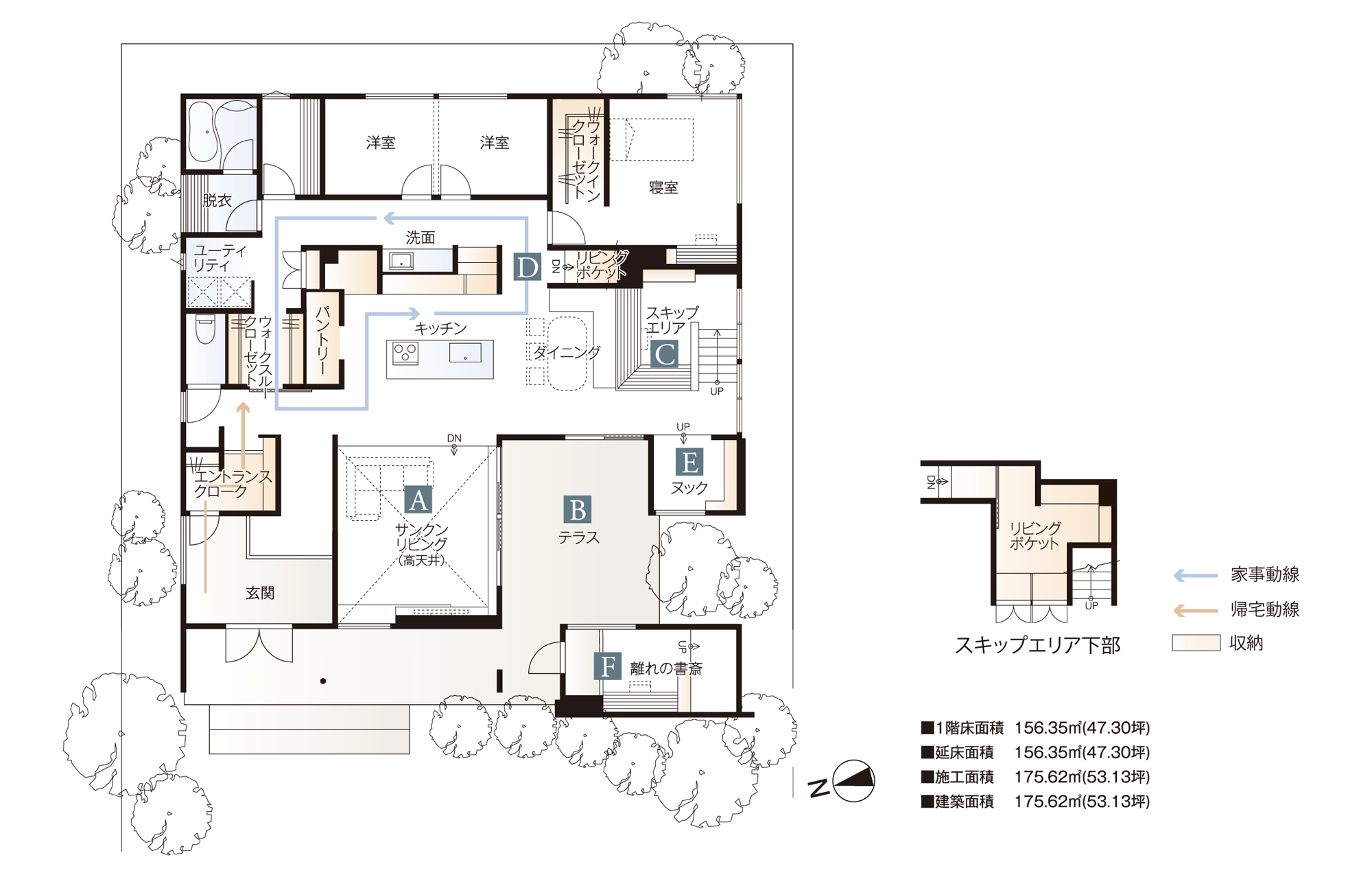 室内と外をゆるやかにつなぐテラス、視線にリズムを生むスキップフロア、そして、心をほどくヌックという余白。それぞれが暮らしにゆたかさと奥行きを添える空間です。