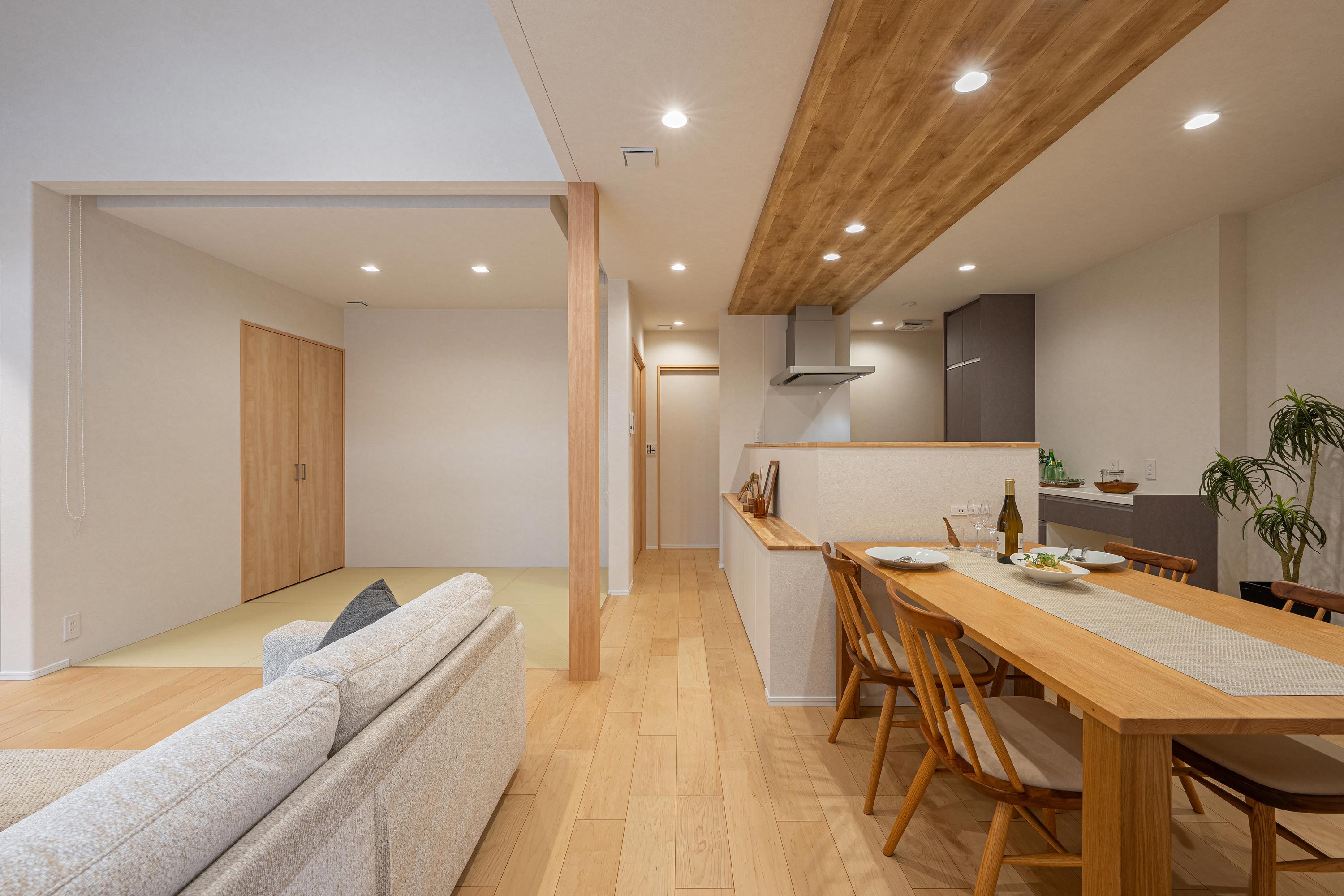 ロールカーテンで仕切ることもできる和室。子育てや、来客時に重宝します。