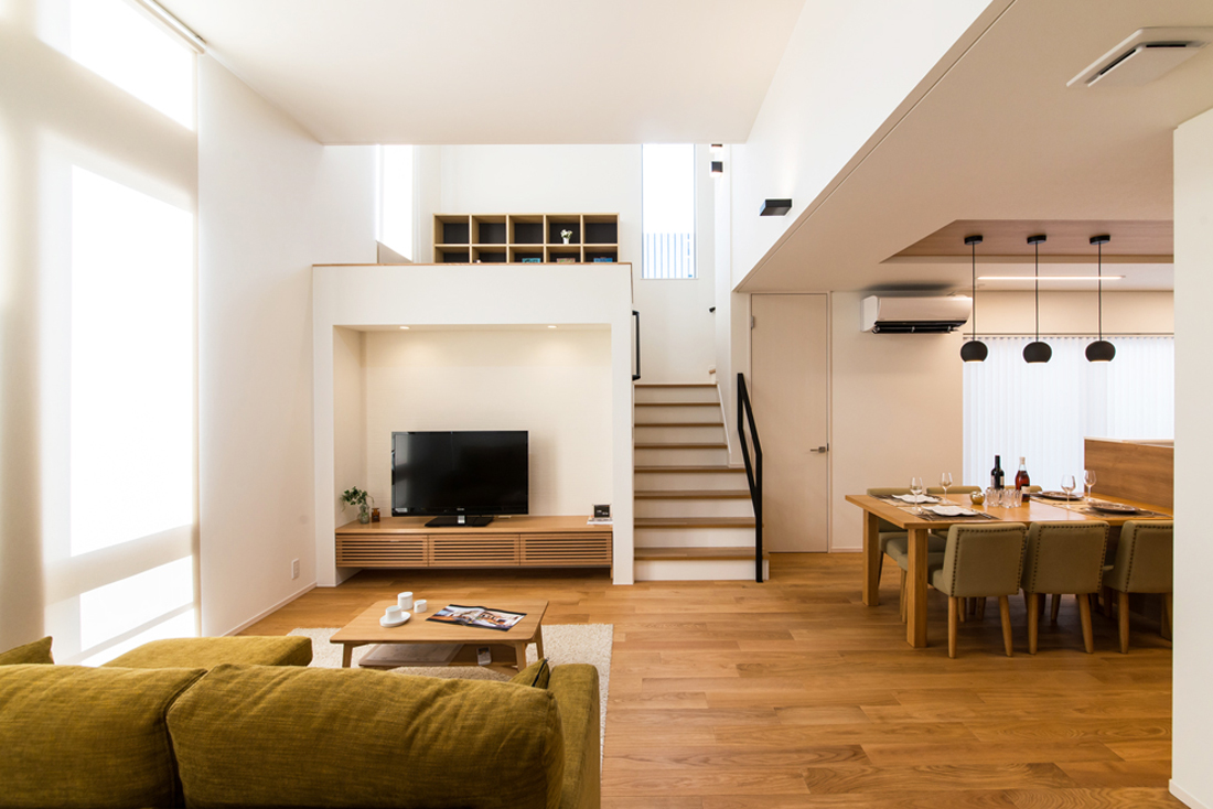 家族の顔が見えるオープンスタイルのキッチンとダイニングを中心に、和室とリビングをL字型に配置した、奥行きのある空間設計。キッチンからは、どこにいてもLDK全体が見渡せ、家族の気配を感じられます。