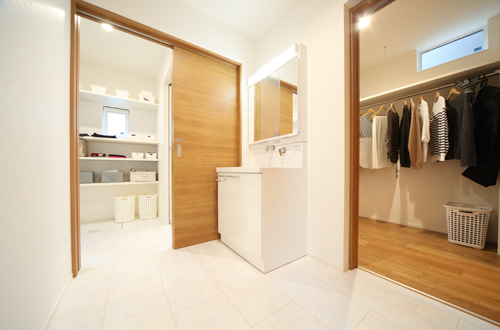 キッチン横に水廻りを集約し、収納も配置。それらを行き止まりなく回遊できる動線で結ぶことで、「料理~洗濯~干す~しまう」の一連の家事を効率良く行えます。